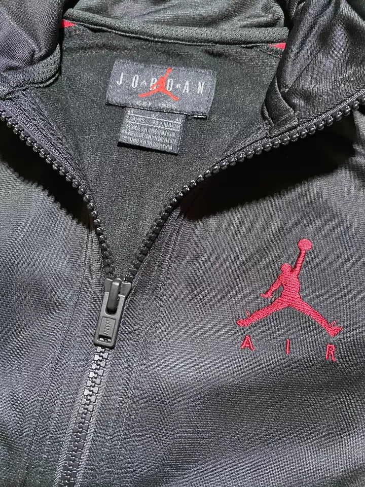 Color block jacket with contrasting pants. Screenprinted Jumpman logo is on both the jacket and pants.